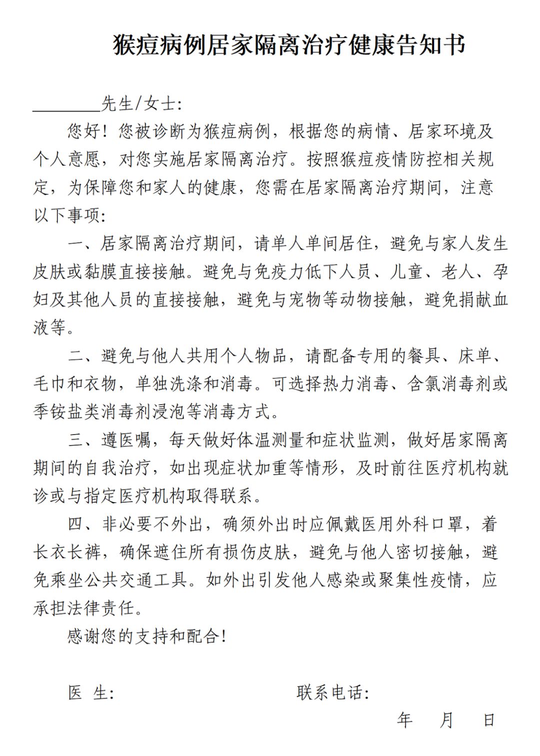 各地發(fā)現(xiàn)猴痘疑似病例和確診病例應(yīng)當(dāng)及時(shí)轉(zhuǎn)運(yùn)至醫(yī)療機(jī)構(gòu)進(jìn)行隔離治療,如臨床癥狀明顯好轉(zhuǎn),病變部位已結(jié)痂,可轉(zhuǎn)為居家隔離治療,直至皮疹結(jié)痂自然脫落,解除居家隔離。對病情較輕且具備居家隔離治療條件的確診病例,經(jīng)醫(yī)療機(jī)構(gòu)與疾控機(jī)構(gòu)聯(lián)合評(píng)估后,可直接采取居家隔離治療。對于實(shí)行居家隔離治療的確診病例發(fā)放《猴痘病例居家隔離治療健康告知書》(見附件2)。確診病例居家隔離治療期間,單人單間居住,避免與家人有皮膚或黏膜直接接觸,做好被污染物品的消毒,非必要不外出,確須外出時(shí)穿長衣長褲、佩戴醫(yī)用外科口罩,避免前往人群聚集場所,避免與其他人有皮膚或黏膜直接接觸;指定醫(yī)療機(jī)構(gòu)安排專人負(fù)責(zé)上門或電話隨訪,提供健康咨詢和醫(yī)療指導(dǎo)。