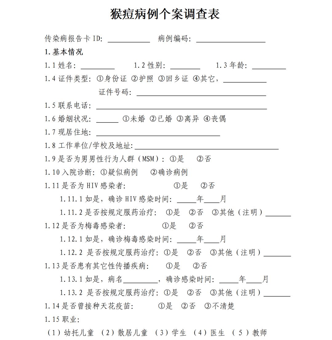 開展個(gè)案調(diào)查時(shí),要認(rèn)真、詳細(xì)了解和記錄病例基本信息、發(fā)病就診情況、臨床表現(xiàn)、轉(zhuǎn)歸及實(shí)驗(yàn)室檢測信息;發(fā)病前21天內(nèi)與可疑感染來源的接觸史、接觸場所及接觸方式;發(fā)病后至隔離治療前的具體活動(dòng)地點(diǎn)、與其有皮膚或黏膜直接接觸者,以及發(fā)病前4天內(nèi)與其有性接觸者。