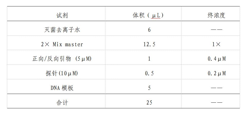 ?、軆x器檢測通道選擇:使用熒光定量PCR檢測儀,選擇Fam熒光信號(hào)檢測通道,收集設(shè)在60℃。具體設(shè)置方法參照各儀器使用說明書。