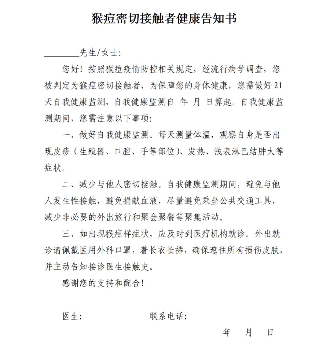 密切接觸者自我健康監(jiān)測期間可正常生活與工作,需避免與他人發(fā)生性接觸等密切接觸,避免捐獻(xiàn)血液等;堅(jiān)持每天做好體溫測量和癥狀監(jiān)測,出現(xiàn)猴痘樣癥狀應(yīng)及時(shí)就診并主動(dòng)報(bào)告可疑接觸史。轄區(qū)疾控機(jī)構(gòu)或基層醫(yī)療衛(wèi)生機(jī)構(gòu)應(yīng)在密切接觸者自我健康監(jiān)測第7、14、21天上門或電話對其進(jìn)行隨訪,提供咨詢指導(dǎo),發(fā)現(xiàn)異常情況及時(shí)進(jìn)行處置。