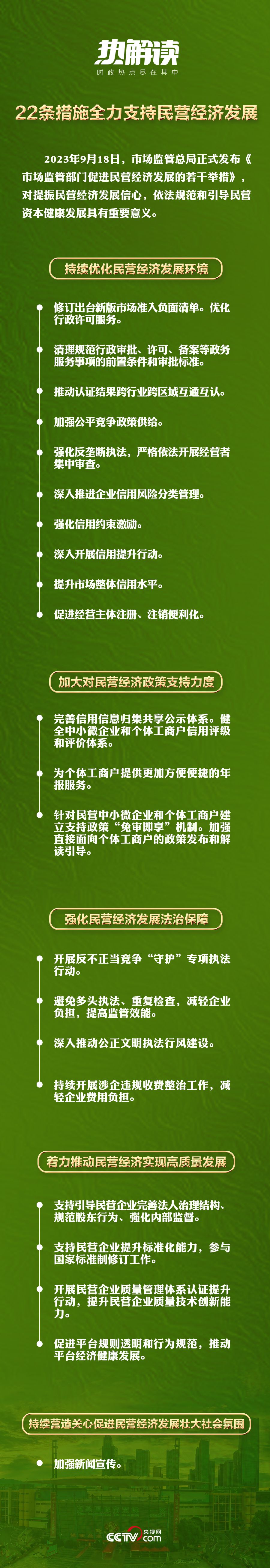 2023年7月14日,中共中央國(guó)務(wù)院出臺(tái)《關(guān)于促進(jìn)民營(yíng)經(jīng)濟(jì)發(fā)展壯大的意見(jiàn)》,對(duì)促進(jìn)民營(yíng)經(jīng)濟(jì)發(fā)展壯大作出新的重大部署。2023年9月18日,市場(chǎng)監(jiān)管總局發(fā)布《市場(chǎng)監(jiān)管部門(mén)促進(jìn)民營(yíng)經(jīng)濟(jì)發(fā)展的若干舉措》,通過(guò)22條措施為全力支持民營(yíng)經(jīng)濟(jì)發(fā)展設(shè)計(jì)了具體落實(shí)的“施工圖”。