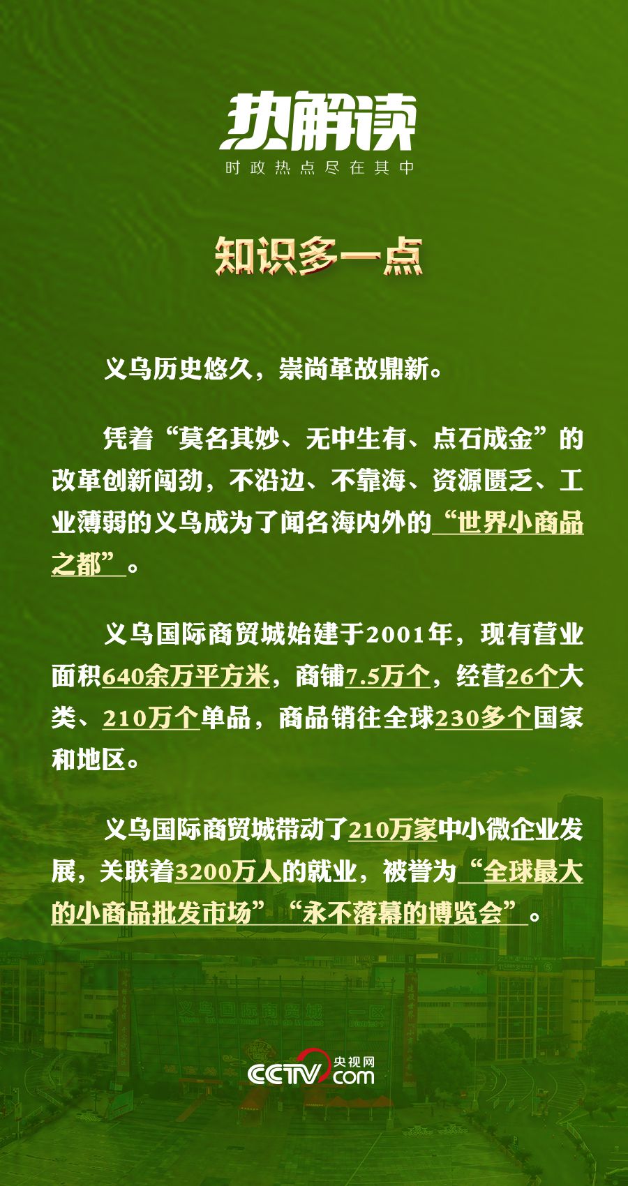“小生意”也能闖出“大市場(chǎng)”。這座全球單體面積最大的小商品批發(fā)市場(chǎng)共有7.5萬(wàn)家商鋪,年成交額超過(guò)2000億元;來(lái)自世界各地的客商到這里采購(gòu)商品、洽談合作,日均客流量超過(guò)20萬(wàn)人次;平均每天有3000萬(wàn)件快遞從這里發(fā)出,寄給全球各地的客戶……