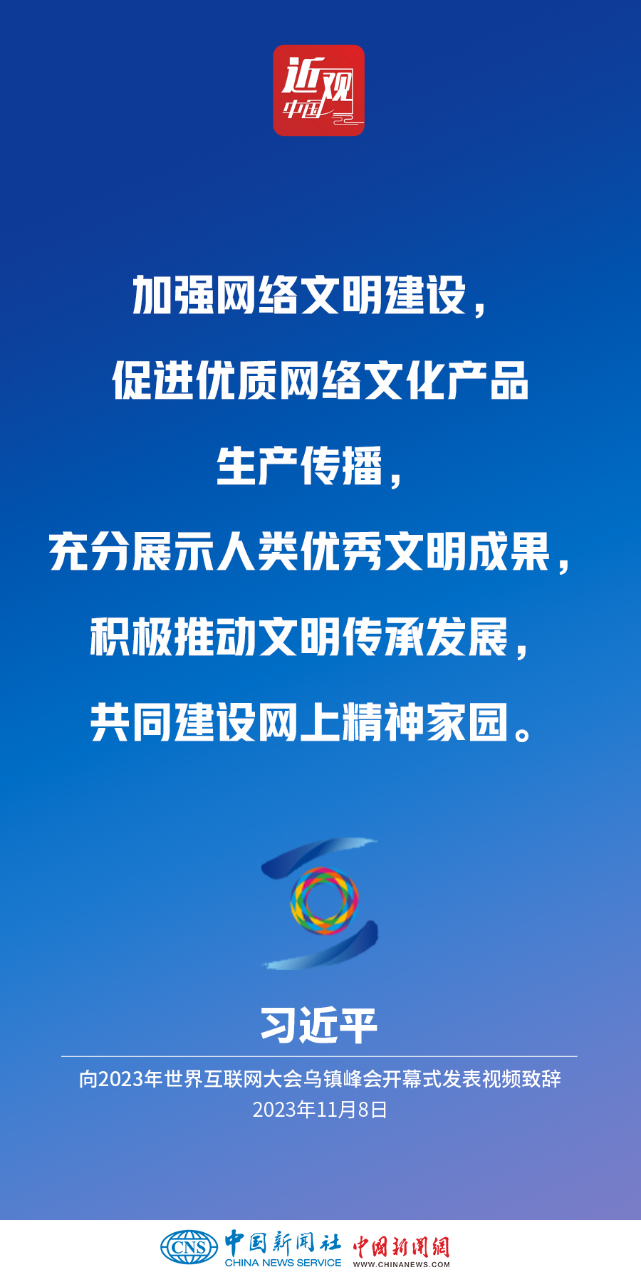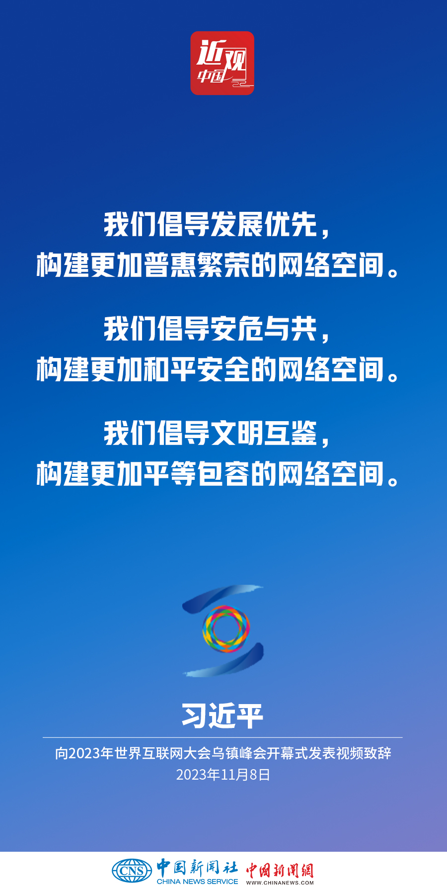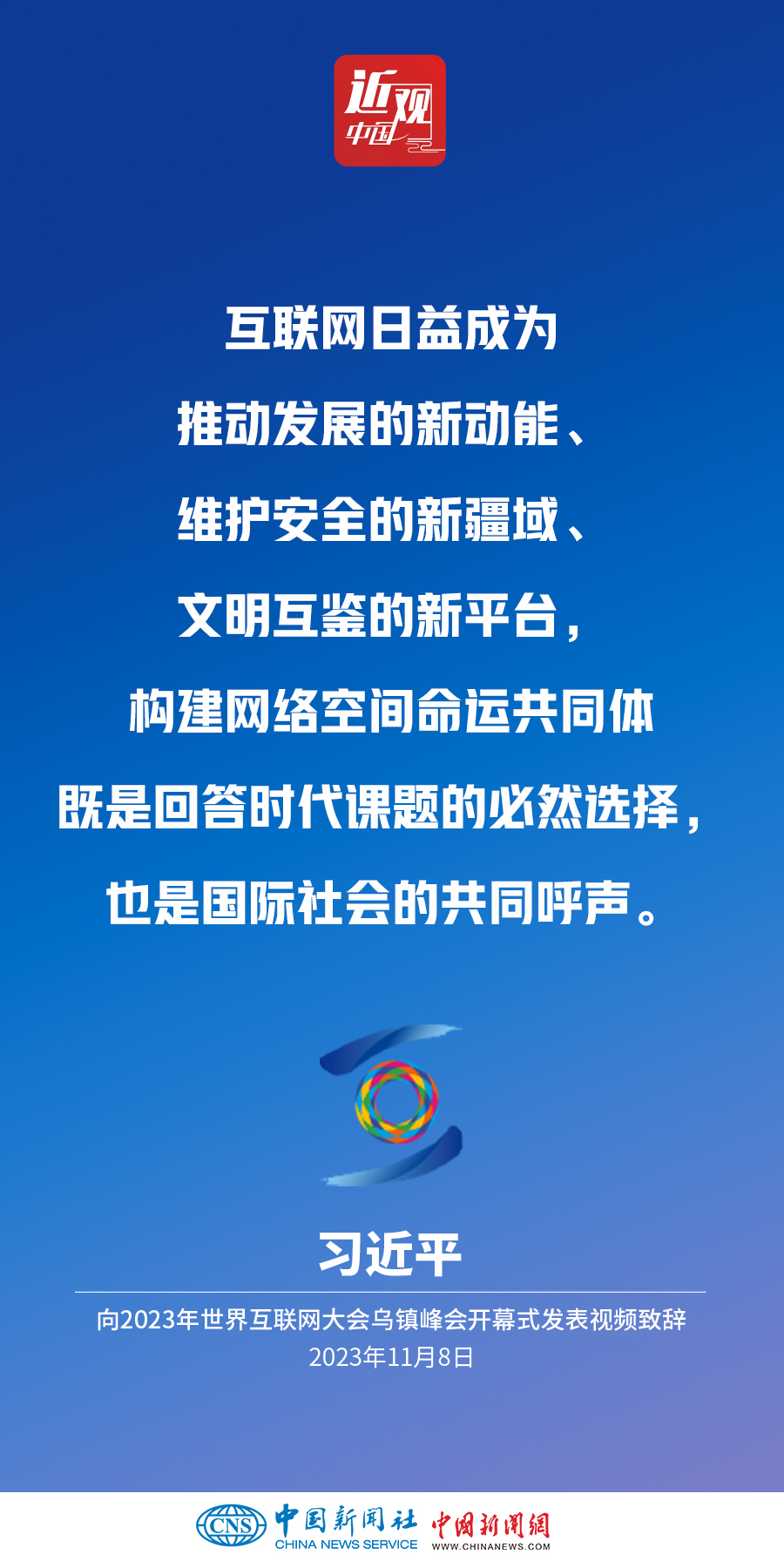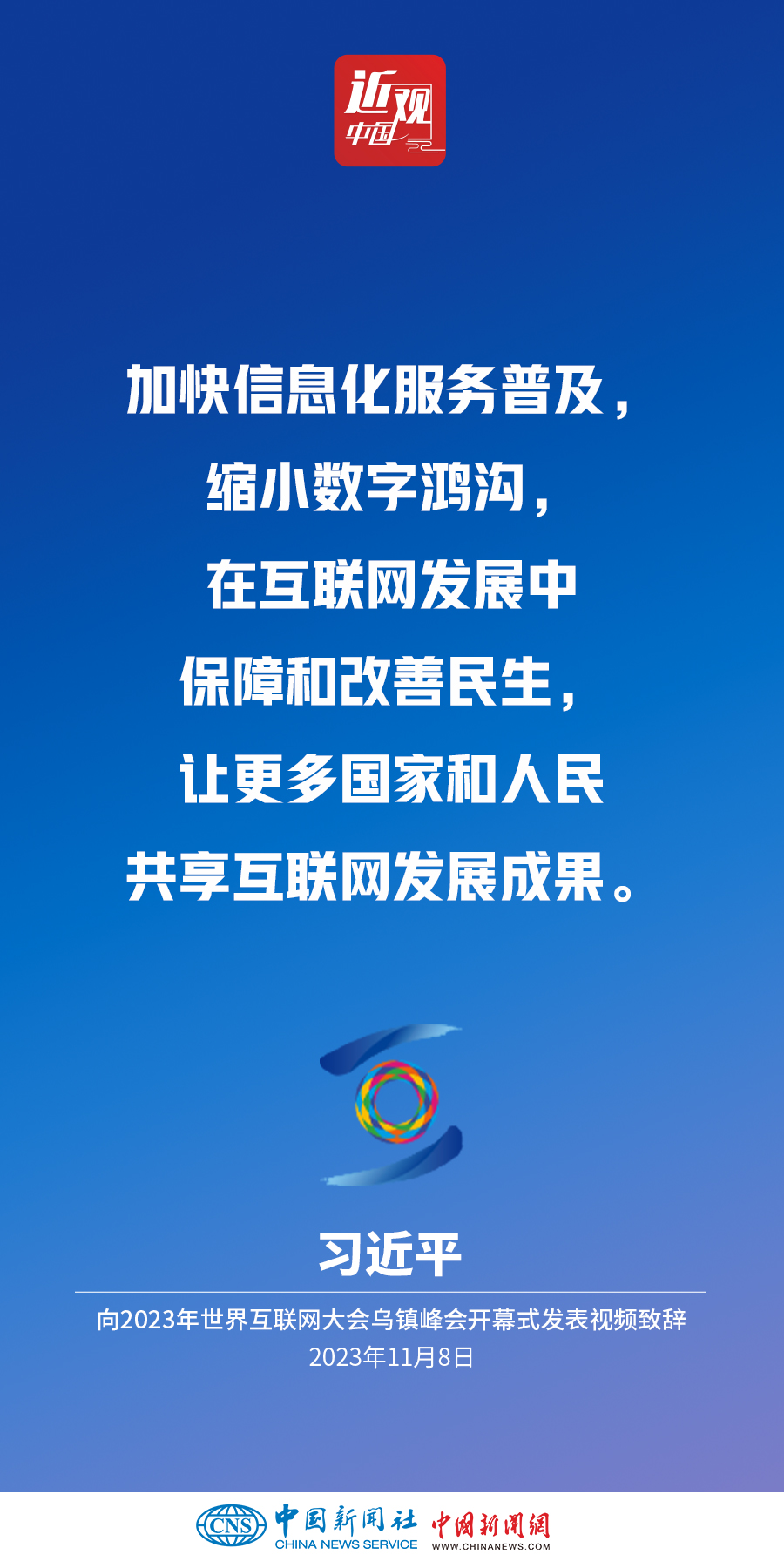 11月8日上午,國(guó)家主席習(xí)近平向2023年世界互聯(lián)網(wǎng)大會(huì)烏鎮(zhèn)峰會(huì)開幕式發(fā)表視頻致辭。他指出——