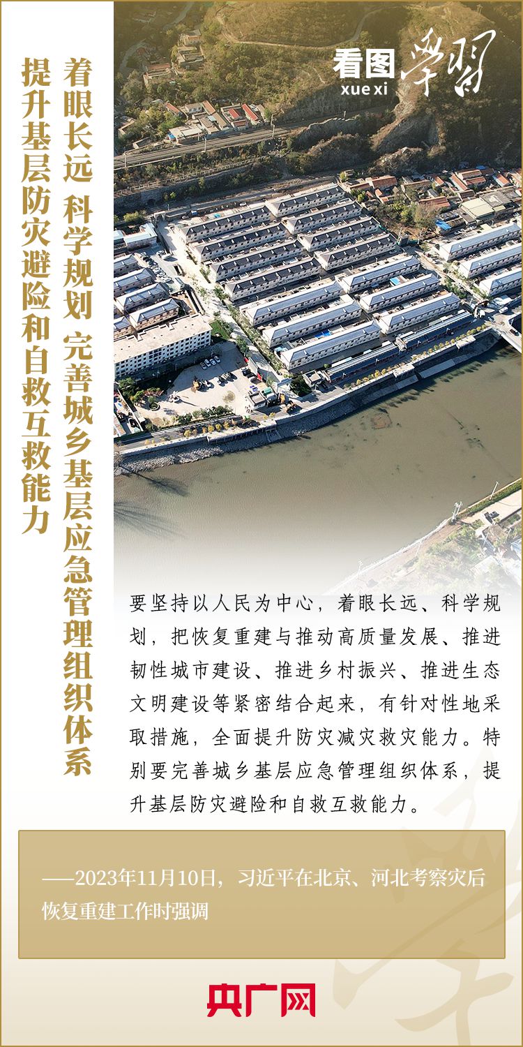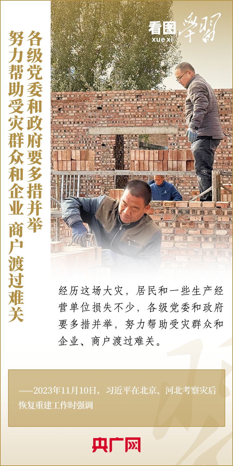 11月10日,習(xí)近平總書記在北京、河北考察災(zāi)后恢復(fù)重建工作??倳浬钊雽W(xué)校、社區(qū)、村莊、水利工程工地,實(shí)地察看村容村貌,了解基礎(chǔ)設(shè)施恢復(fù)建設(shè)提升等情況,要求有關(guān)部門堅(jiān)持以人民為中心,堅(jiān)持系統(tǒng)觀念,著眼長(zhǎng)遠(yuǎn)、科學(xué)規(guī)劃,把恢復(fù)重建與推動(dòng)高質(zhì)量發(fā)展、推進(jìn)韌性城市建設(shè)、推進(jìn)鄉(xiāng)村振興、推進(jìn)生態(tài)文明建設(shè)等緊密結(jié)合起來(lái),有針對(duì)性地采取措施,再接再厲抓好災(zāi)后恢復(fù)重建,確保廣大人民群眾安居樂(lè)業(yè)、溫暖過(guò)冬。
