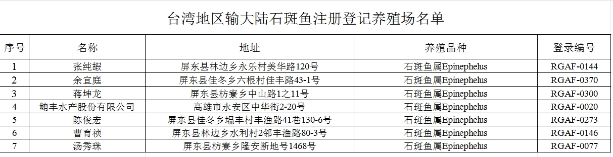 臺灣地區(qū)輸大陸石斑魚注冊登記養(yǎng)殖場名單。 圖片來源:海關(guān)總署網(wǎng)站