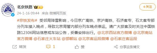 中新網1月16日電 據北京鐵路微博消息,受鄰局降雪影響,今日京廣高鐵、京滬高鐵、石濟客專、石太客專部分列車接入晚點,導致北京局管內部分列車晚點停運。北京鐵路請廣大旅客及時關注中國鐵路12306網站信息或車站公告,妥善安排出行。