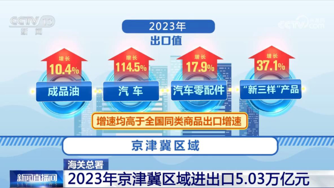 在出口方面,2023年京津冀區(qū)域出口1.31萬(wàn)億元,增長(zhǎng)2.5%,占全國(guó)出口總值的5.5%,其中,成品油、汽車、汽車零配件、“新三樣”產(chǎn)品的出口值分別增長(zhǎng)10.4%、114.5%、17.9%、37.1%,增速均高于全國(guó)同類商品出口增速。