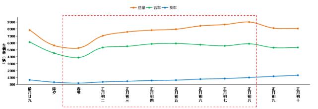 預(yù)計春節(jié)期間全國高速公路客車日均流量約4890萬輛,小客車占客車比例預(yù)計達99%以上。貨車流量在春節(jié)節(jié)前逐日下降,在正月初一達到最低值,春節(jié)假期之后逐漸恢復(fù)到日常水平,但貨車流量同比去年預(yù)計有所增長。