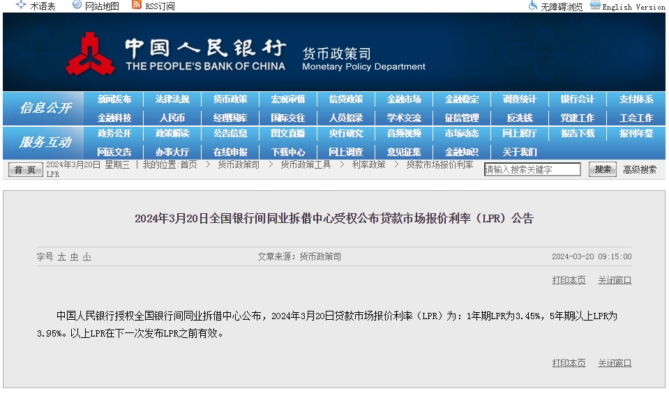 中新網(wǎng)3月20日電 據(jù)中國(guó)人民銀行網(wǎng)站消息,中國(guó)人民銀行授權(quán)全國(guó)銀行間同業(yè)拆借中心公布,2024年3月20日貸款市場(chǎng)報(bào)價(jià)利率(LPR)為:1年期LPR為3.45%,5年期以上LPR為3.95%。以上LPR在下一次發(fā)布LPR之前有效。3月LPR與2月保持一致,未作調(diào)整。