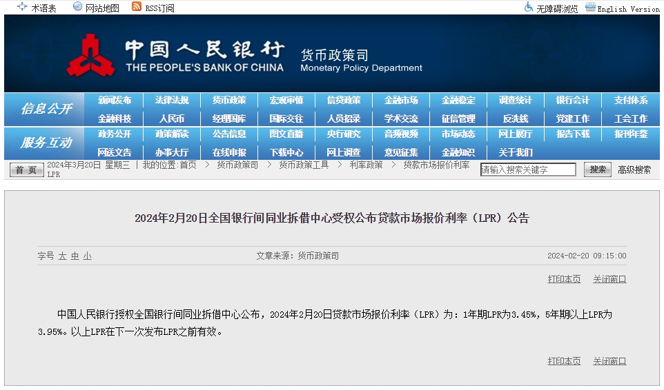 2024年3月貸款市場(chǎng)報(bào)價(jià)利率(LPR)保持不變