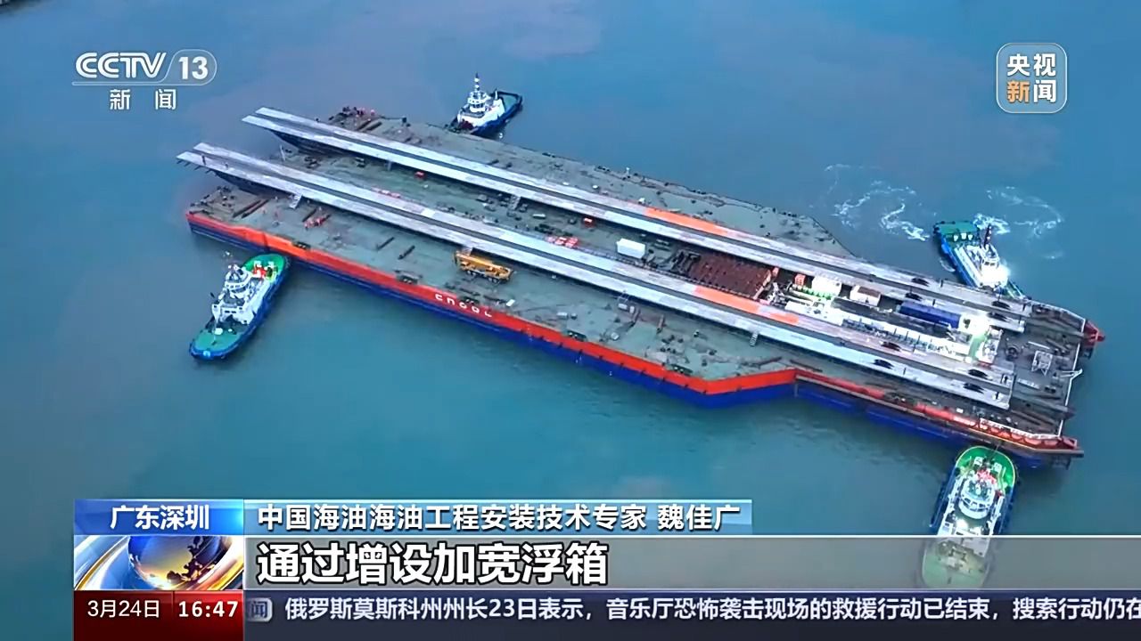 總臺央視記者 古峻嶺:這里是位于深圳東南方向240多公里處的流花油田海域,我們現(xiàn)在看到的這個大家伙,就是搭乘亞洲最大下水駁船——海洋石油229的?;柹詈?dǎo)管架。它相當(dāng)于海上平臺穩(wěn)穩(wěn)矗立在海底的“大長腿”,用鋼量接近于一整個“鳥巢”國家體育館。它是從廣東珠海出發(fā),經(jīng)過40多個小時的長距離拖航,剛剛抵達(dá)這一片施工海域。目前正在進(jìn)行海上安裝前最后的準(zhǔn)備工作。