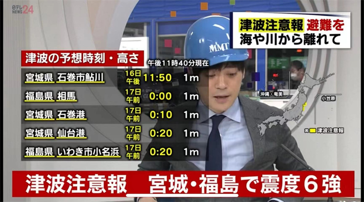 3月16日日本福島縣海域發(fā)生7.4級(jí)地震,當(dāng)?shù)匕l(fā)出海嘯警報(bào)。圖片來(lái)源:日本新聞報(bào)道截圖