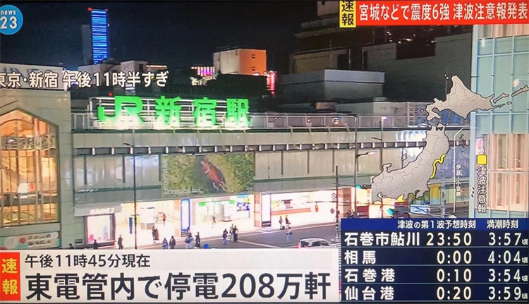 3月16日日本福島縣海域發(fā)生7.4級(jí)地震,導(dǎo)致大規(guī)模停電。圖片來(lái)源:日本電視臺(tái)報(bào)道截圖