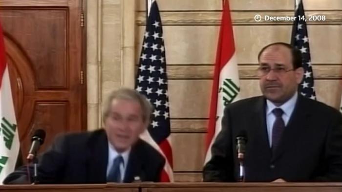 2008年12月,時(shí)任美國(guó)總統(tǒng)小布什在伊拉克首都巴格達(dá)的新聞發(fā)布會(huì)上,被伊拉克記者蒙塔達(dá)爾·扎伊迪扔鞋。圖片來源:路透社視頻截圖