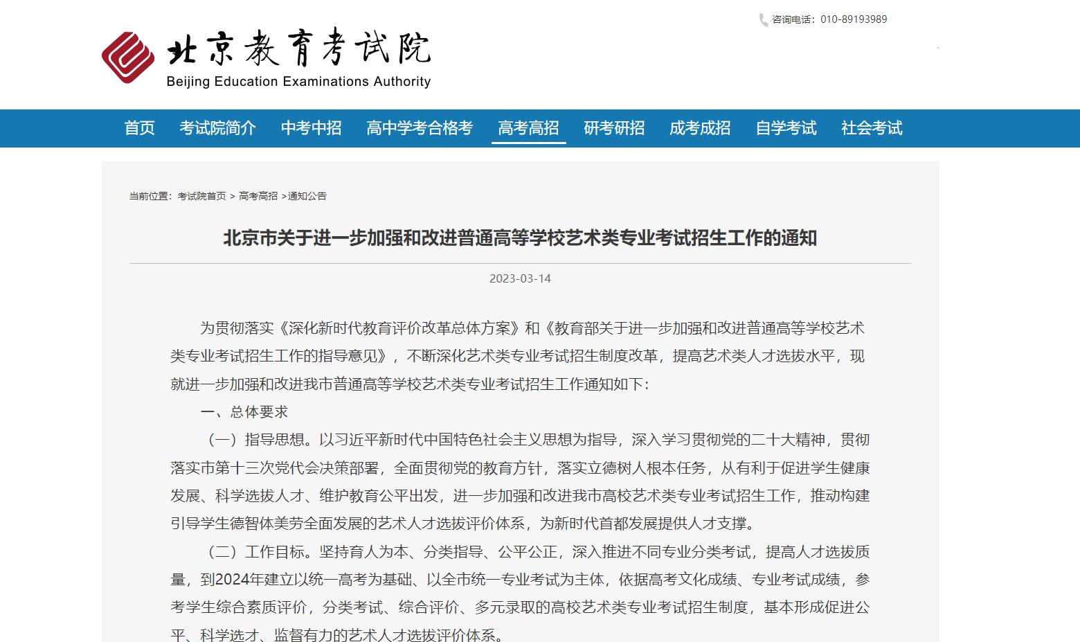 根據(jù)《北京市關(guān)于進一步加強和改進普通高等學(xué)校藝術(shù)類專業(yè)考試招生工作的通知》(以下簡稱《通知》),高校藝術(shù)類專業(yè)招生實行“文化素質(zhì)+專業(yè)能力”的考試評價方式,文化素質(zhì)使用高考文化課考試成績,專業(yè)能力使用藝術(shù)專業(yè)能力考試成績。