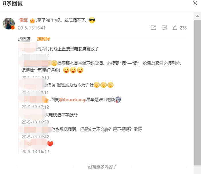 2020年,購買98英寸Redmi MAX 98的王先生安裝電視時動用了吊車,在網(wǎng)絡(luò)上引發(fā)關(guān)注。當(dāng)時小米之家用了相關(guān)圖片刊發(fā)了微博,雷軍還評論“買了98"電視,就低調(diào)不了”。