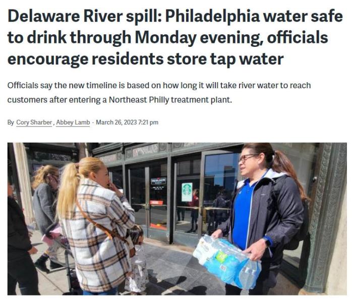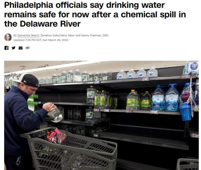 中新網(wǎng)3月27日電 綜合外媒報(bào)道,近日,美國(guó)賓州布里斯托爾一家工廠發(fā)生泄漏事故,大量化學(xué)物質(zhì)流入特拉華河一條支流中。事故發(fā)生后,費(fèi)城官員建議當(dāng)?shù)孛癖娛褂闷垦b水,引發(fā)恐慌性購(gòu)買。