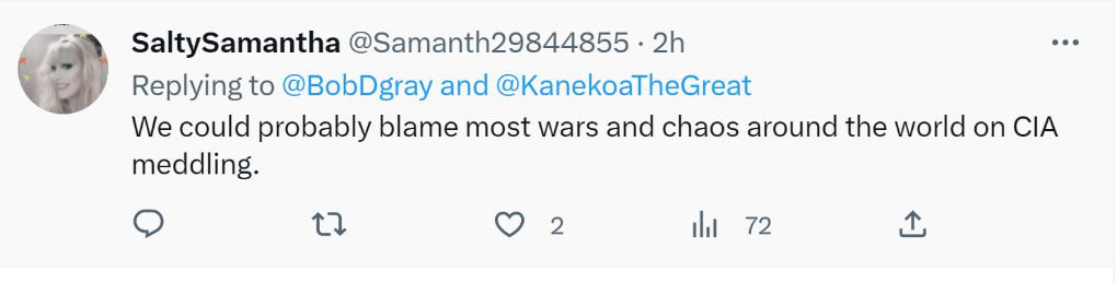 網(wǎng)友“有趣的薩曼莎”說:“世界上絕大多數(shù)的戰(zhàn)爭(zhēng)和混亂都是美國(guó)中央情報(bào)局帶來的吧。”