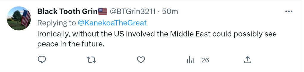 一名自我介紹是美國(guó)退役軍人的網(wǎng)友“現(xiàn)身說法”:“真諷刺,沒有美國(guó)摻和,中東或許未來就會(huì)實(shí)現(xiàn)和平。