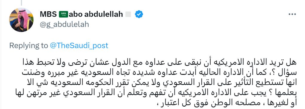 沙特網(wǎng)友阿博·阿卜杜勒拉言辭激烈地批評(píng):“只有我們與其他國(guó)家保持?jǐn)骋饷绹?guó)才不會(huì)失望嗎?美國(guó)政府對(duì)沙特表現(xiàn)出強(qiáng)烈而無理的敵意,居然還認(rèn)為它可以影響沙特的決定、沙特只能在它的指導(dǎo)下做事?美國(guó)政府必須了解,沙特的決定不依附于任何其他人。祖國(guó)的利益高于一切。