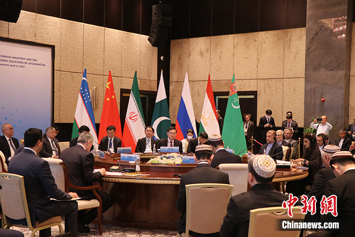 當(dāng)?shù)貢r間4月13日,烏茲別克斯坦撒馬爾罕,第四次阿富汗鄰國外長會舉行。 中新社記者 張碩 攝