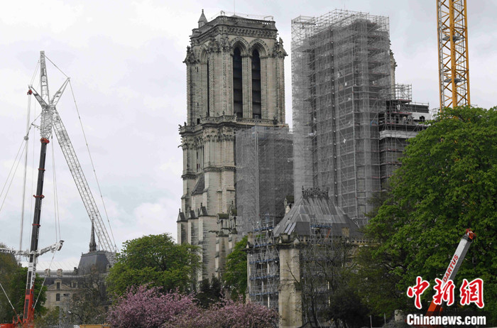 2023年4月15日是巴黎圣母院大火四周年。巴黎圣母院塔尖基座的安裝現(xiàn)已進入收尾階段。塔尖基座的安裝完成后,在大火中被燒毀的塔尖將得以被重新安裝起來。 中新社記者 李洋 攝
