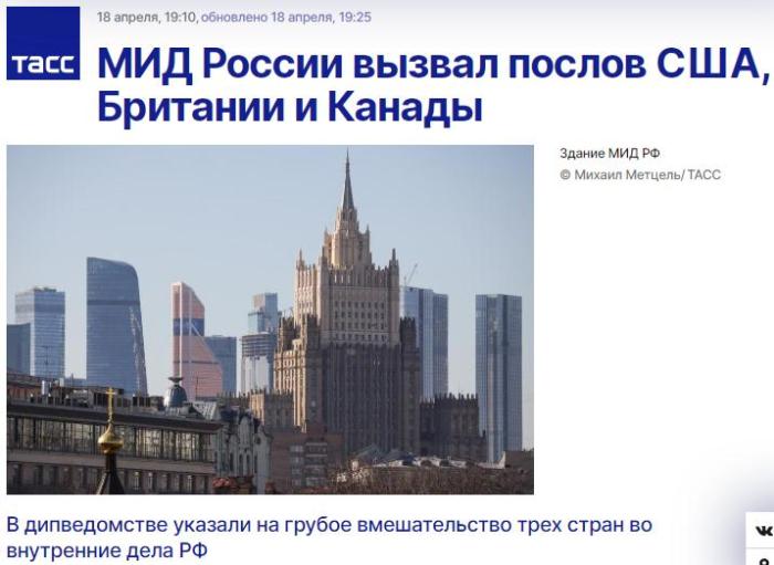 據(jù)報道,俄外交部表示,“由于粗暴干涉俄羅斯內(nèi)部事務和從事不符合外交地位的活動,美國、英國和加拿大的大使被俄外交部召見?!?/p>