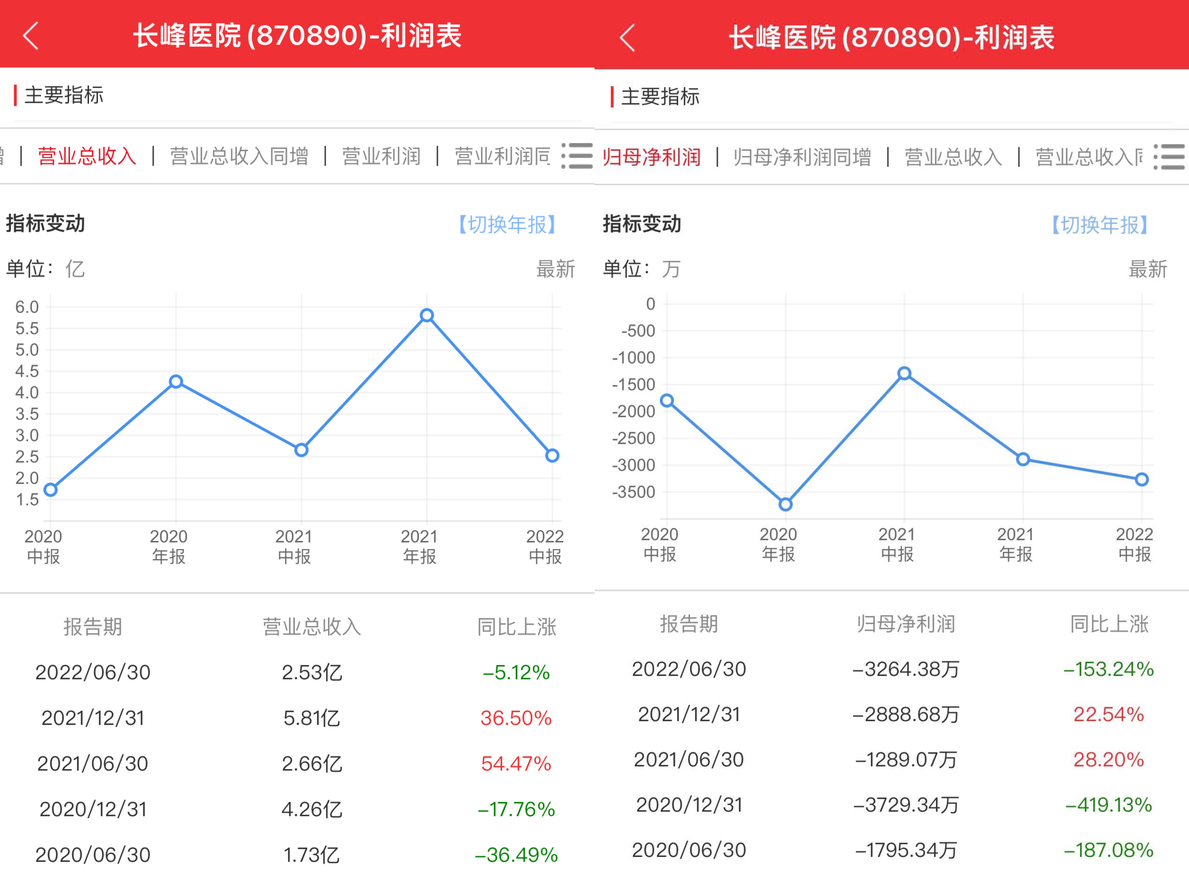 進(jìn)入2022年上半年,長(zhǎng)峰醫(yī)院的虧損也在持續(xù)擴(kuò)大,公司營(yíng)收和歸母凈利潤(rùn)分別為2.53億元、-3264.38萬(wàn)元,分別同比減少5.12%、153.23%;毛利率20.67%,較上年同期下降 29.82%。