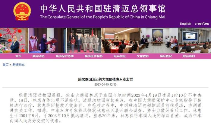中新網(wǎng)4月19日電 據(jù)中國(guó)駐清邁總領(lǐng)事館消息,根據(jù)清邁動(dòng)物園通報(bào),旅泰大熊貓林惠于泰國(guó)當(dāng)?shù)貢r(shí)間2023年4月19日凌晨1時(shí)10分不幸去世。