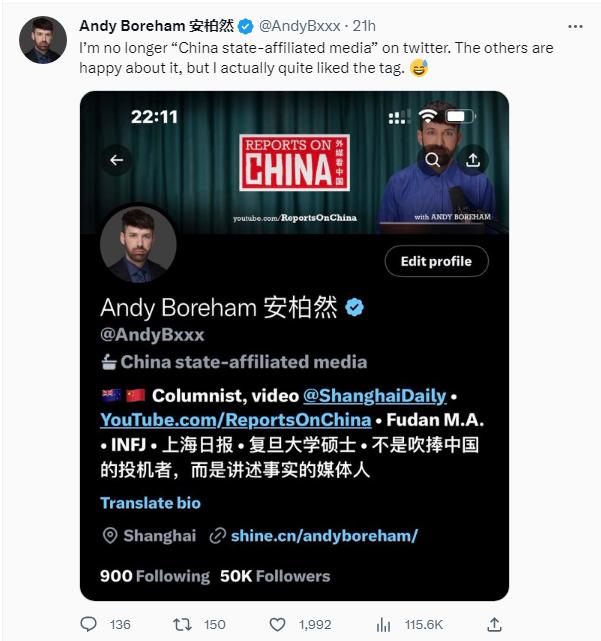 在上海工作生活了近10年的新西蘭媒體人安柏然寫道,“我不再是推特上的‘中國官方媒體’了。其他人對此很高興,但我其實(shí)很喜歡這個標(biāo)簽?!?/p>