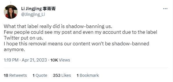 中國英文主持人李菁菁指出,推特的“官媒”標(biāo)簽實(shí)際是一種“影子禁令”,為暗中設(shè)限提供方便?!坝捎谕铺亟o我們貼上了標(biāo)簽,很少有人能看到我的帖子,甚至很難找到我的賬號。我希望這次刪除(標(biāo)簽)意味著我們發(fā)布的內(nèi)容不會再被暗中禁止?!?/p>