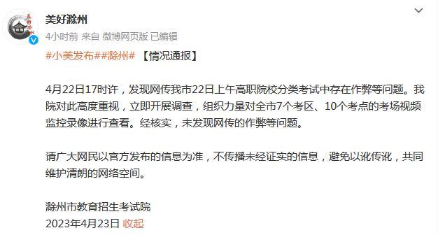 中新網(wǎng)4月23日電 據(jù)安徽省滁州市委宣傳部官方微博消息,滁州市教育招生考試院23日發(fā)布情況通報。通報稱,4月22日17時許,發(fā)現(xiàn)網(wǎng)傳滁州市22日上午高職院校分類考試中存在作弊等問題。