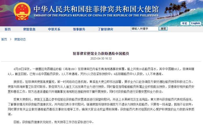 接報后,駐菲律賓使館高度重視,第一時間啟動應(yīng)急機(jī)制,黃溪連大使立即作出部署,要求全力以赴協(xié)調(diào)各方做好遇險船員搜尋和救治工作。使館與菲海岸警衛(wèi)隊密切聯(lián)系,敦促菲方從人道主義出發(fā)竭盡全力進(jìn)行搜救,同時督促指導(dǎo)船舶船員所屬企業(yè)積極配合搜救,妥善做好相關(guān)船員安置和善后工作。菲方迅速派遣船只并調(diào)集事發(fā)海域附近漁船持續(xù)不懈開展搜救,同時對獲救船員進(jìn)行妥善安置和全力救治。