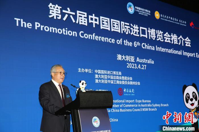 當(dāng)?shù)貢r(shí)間4月27日下午,第六屆中國國際進(jìn)口博覽會(huì)澳大利亞推介會(huì)在悉尼舉辦。中國國際進(jìn)口博覽局副局長劉福學(xué)與會(huì)并致辭。中新社記者 顧時(shí)宏 攝