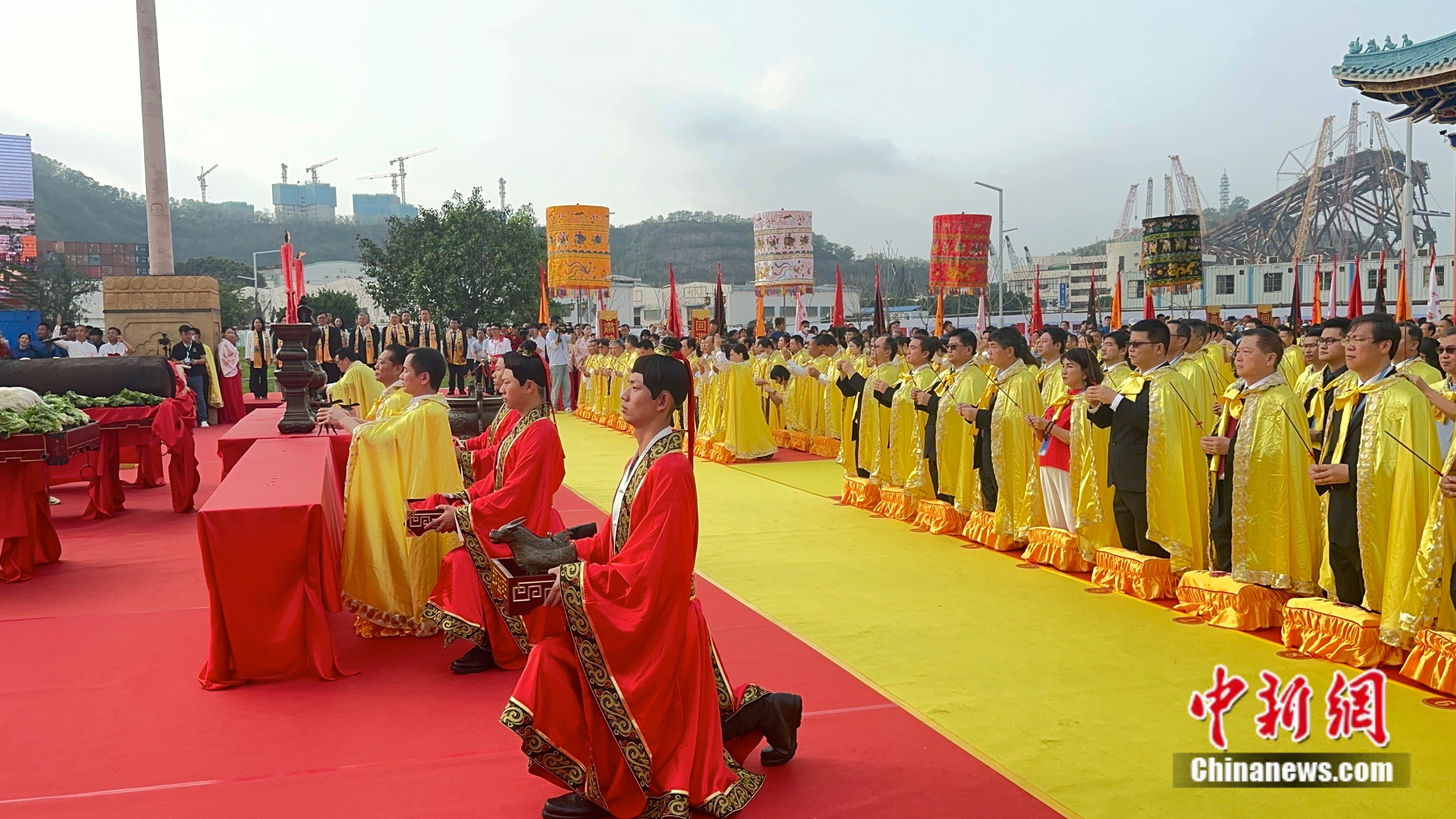上午7點(diǎn)30分,正祭儀式正式開(kāi)始。深圳南山天后博物館遵循古制,恢復(fù)古禮,結(jié)合嶺南傳統(tǒng)文化,再現(xiàn)明代“辭沙”祭祀的場(chǎng)景。大典現(xiàn)場(chǎng),祭祀嘉賓和承獻(xiàn)官等在主持人的引導(dǎo)下,將祭祀流程一一完整演繹。
