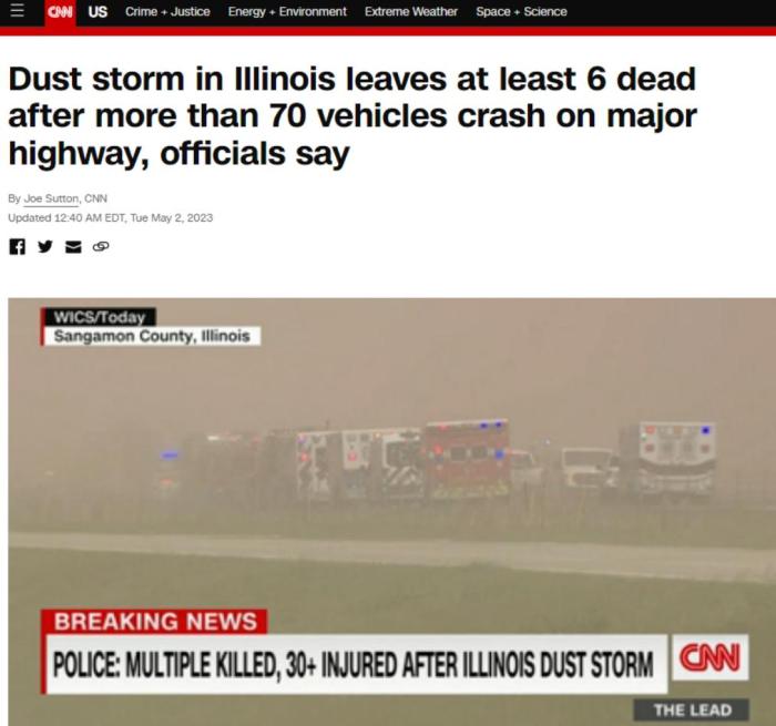 中新網(wǎng)5月2日電 綜合美媒消息,當(dāng)?shù)貢r(shí)間5月1日,由于沙塵暴導(dǎo)致能見(jiàn)度降低,70余輛汽車(chē)在美國(guó)伊利諾伊州55號(hào)州際公路蒙哥馬利縣法默斯維爾鎮(zhèn)附近路段相撞,事故已造成至少6人死亡,37人受傷入院。