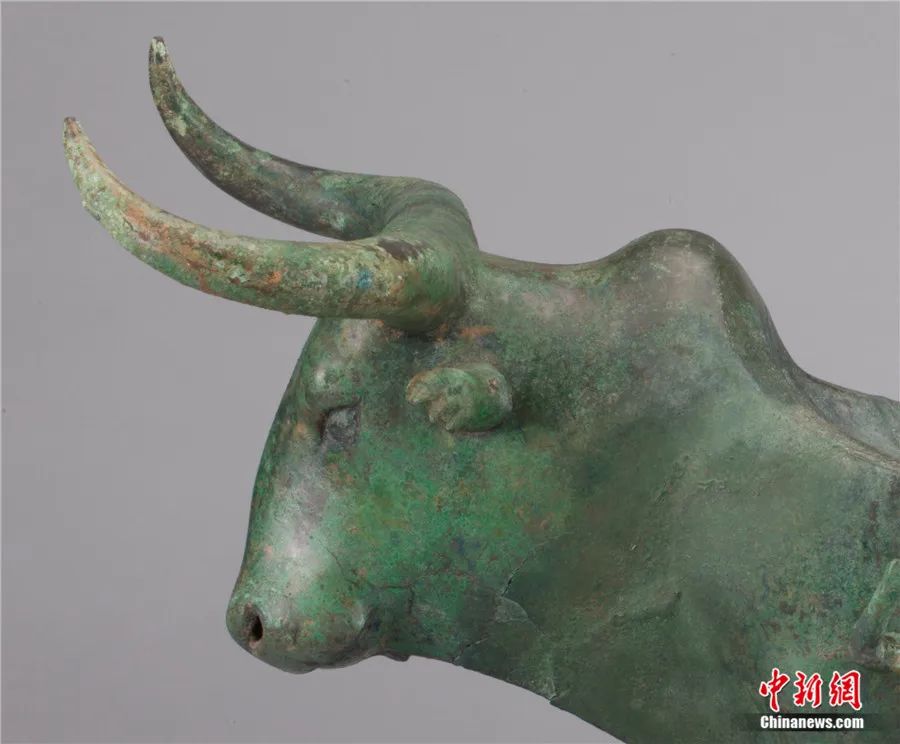 ?;~案的器物主體是一頭封牛,其特點(diǎn)在于兩邊牛角向內(nèi)彎曲,牛角尖向上翹起,牛脖子上有一個(gè)隆起部分,像駱駝的駝峰。封牛曾是亞洲的主要牛種之一,云南地區(qū)的封牛則通過有著“南方絲綢之路”之稱的蜀身毒道,從印度至緬甸,后進(jìn)入云南。這條交通要道促進(jìn)了滇國與其他文明在商貿(mào)、文化上的交流融合。