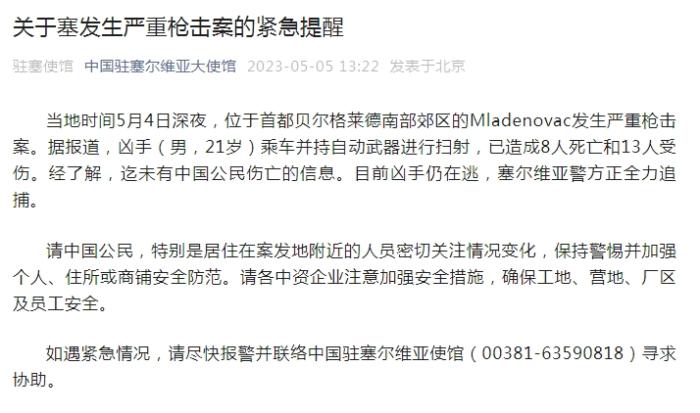中新網(wǎng)5月5日電 據(jù)中國駐塞爾維亞大使館微信公眾號消息,當(dāng)?shù)貢r(shí)間5月4日深夜,位于首都貝爾格萊德南部郊區(qū)的Mladenovac發(fā)生嚴(yán)重槍擊案。據(jù)報(bào)道,兇手(男,21歲)乘車并持自動(dòng)武器進(jìn)行掃射,已造成8人死亡和13人受傷。經(jīng)了解,迄未有中國公民傷亡的信息。目前兇手仍在逃,塞爾維亞警方正全力追捕。