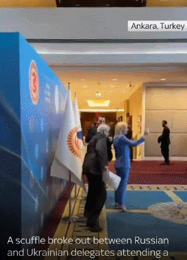 中新網(wǎng)5月5月電 綜合外媒報(bào)道,當(dāng)?shù)貢r間4日,在土耳其安卡拉舉行的黑海經(jīng)濟(jì)合作組織議會大會(PABSEC)會議間隙,俄烏代表團(tuán)成員因?yàn)橐幻鏋蹩颂m國旗扭打在了一起。
