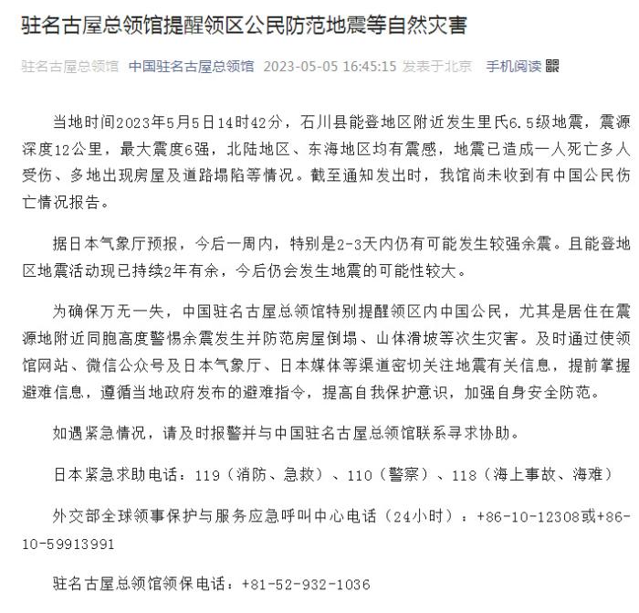 為確保萬無一失,中國駐名古屋總領館特別提醒領區(qū)內(nèi)中國公民,尤其是居住在震源地附近同胞高度警惕余震發(fā)生并防范房屋倒塌、山體滑坡等次生災害。及時通過使領館網(wǎng)站、微信公眾號及日本氣象廳、日本媒體等渠道密切關注地震有關信息,提前掌握避難信息,遵循當?shù)卣l(fā)布的避難指令,提高自我保護意識,加強自身安全防范。