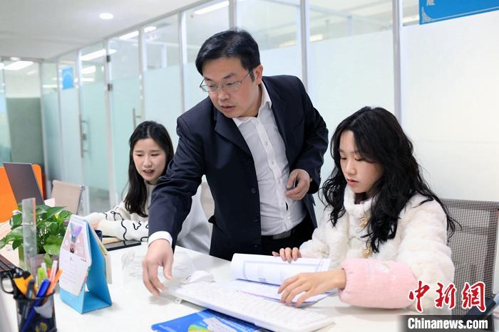 圖為2月23日,四川成都,郭弘揚(中)與同事一起查看資料。 中新社記者 王磊 攝