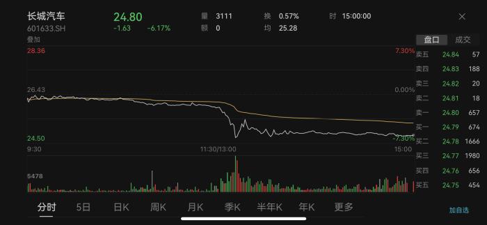 25日盤(pán)中,長(zhǎng)城汽車一度跌超7%,比亞迪跌超2%。截至收盤(pán),長(zhǎng)城汽車股價(jià)報(bào)24.80元,下跌6.17%。比亞迪股價(jià)報(bào)255.60元,下跌2.41%。汽車整車板塊則下跌0.85%。有股民留言,“最慘的是同時(shí)擁有重倉(cāng)長(zhǎng)城汽車和比亞迪的股民,例如我,太慘了?!?/p>