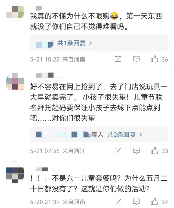 但自5月20日起,在社交平臺(tái)上,就不斷有人反映,已經(jīng)買不到肯德基兒童節(jié)限定玩具??系禄墓俜轿⒉┫?,也有很多人留言,門店已售罄,能不能補(bǔ)貨。
