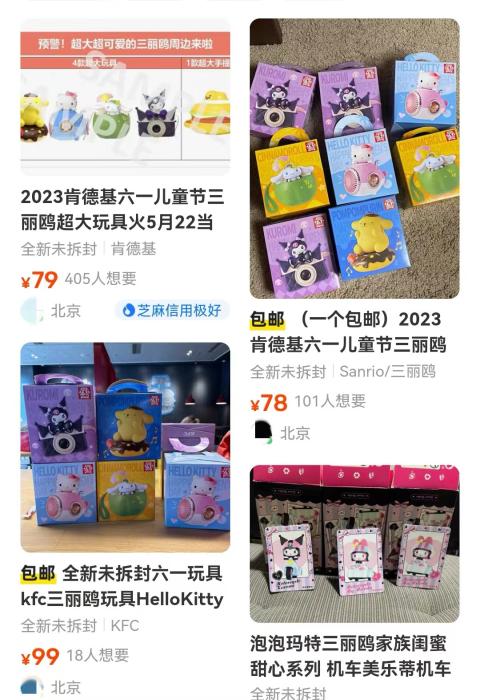在某二手平臺(tái),肯德基此次發(fā)售的三麗鷗玩具,標(biāo)價(jià)集中在70元至100元之間,比69.9元的兒童節(jié)套餐價(jià)格更貴。麥當(dāng)勞俄羅斯方塊游戲機(jī)的價(jià)格多在40元至60元之間。