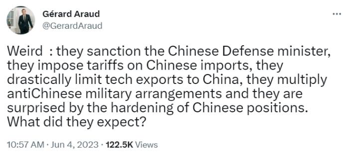 中新網(wǎng)6月5日電 日前,法國前駐美大使熱拉爾·阿羅在推特上提出一個(gè)值得思考的問題,“奇怪,他們(美國)制裁中國國防部長,他們對中國進(jìn)口商品征收關(guān)稅,他們大幅限制對華技術(shù)出口……現(xiàn)在他們反而對中國立場的強(qiáng)硬感到驚訝。美國到底想要什么?”