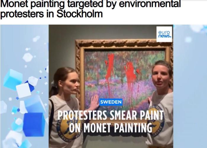 據(jù)法新社報道,這兩名女性環(huán)保主義者屬于瑞典本土組織“Restore Wetlands(恢復濕地)”,她們在畫作表面的保護玻璃上涂紅漆,并在手上涂膠水把手粘在玻璃上。這兩人為護士和實習護士。Restore Wetlands在臉書頁面上發(fā)布了現(xiàn)場視頻。