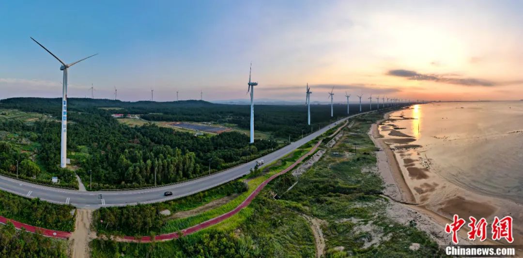 山東省榮成市北環(huán)海路,風(fēng)力發(fā)電機與沿海防護(hù)林形成一道靚麗的風(fēng)景線。近年來,中國大力推廣風(fēng)電產(chǎn)業(yè)等“綠色能源”,實現(xiàn)生態(tài)保護(hù)和可持續(xù)發(fā)展。楊志禮 攝