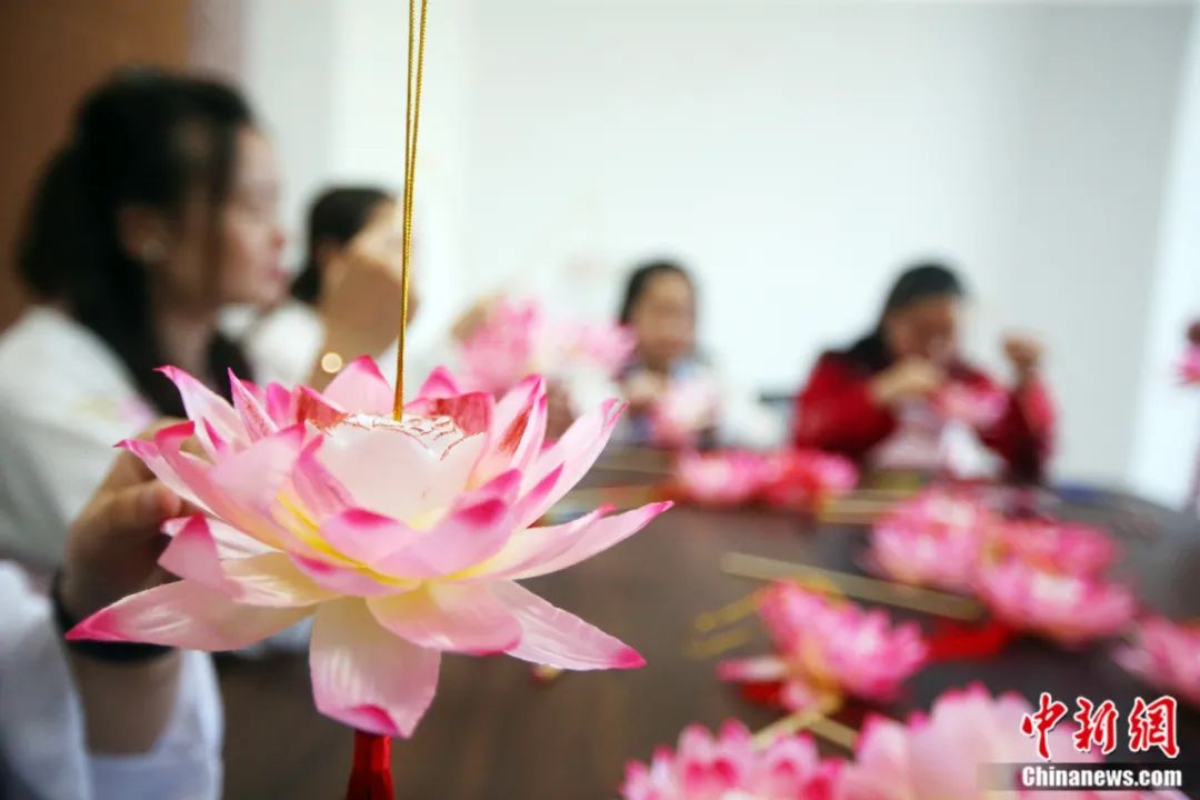 江蘇省南通市崇川區(qū)陳橋街道五里樹社區(qū)居民制作荷花燈。徐培欽 攝