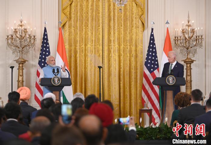 當(dāng)?shù)貢r(shí)間6月22日,印度總理莫迪對(duì)美進(jìn)行國事訪問。圖為美國總統(tǒng)拜登與莫迪在白宮出席聯(lián)合記者會(huì)。中新社記者 陳孟統(tǒng) 攝