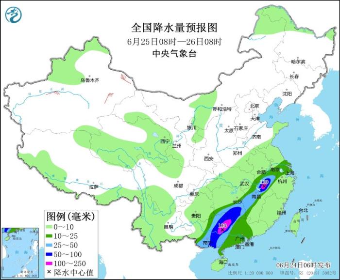 6月24日08時至25日08時,蘇皖南部、上海、浙江北部和西部、福建西北部、江西大部、湖南南部、廣西大部、廣東中西部、云南南部等地部分地區(qū)有大到暴雨,其中,江蘇東南部、上海東部、廣西中部和南部沿海、廣東北部等地局部地區(qū)有大暴雨(100~160毫米)。